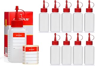 5 x 100 ml Octopus flacons en plastique, flacons faits de plastique en PEHD avec des bouchons pissette ou compte-gouttes rouges, utilisables par exemple pour les e-liquides / e-cigarettes, résistants aux produits chimiques, y compris 5 étiquettes