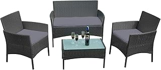Ouhigher Salon de Jardin Salon de Jardin avec 1 Banc + 2 chaises + 1 Table avec Plateau en Verre et Coussin de Dossier 8 cm pour 4 Personnes